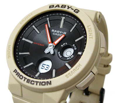 オレンジ ホワイト ブラック 仕様 ■ケースサイズ(H×W×D):45.1×41×13.3mm ■質量:33g ■ケース・ベゼル材質:樹脂 ■樹脂バンド ■耐衝撃構造(ショックレジスト) ■無機ガラス ■ネオブライト ■10気圧防水 ■ネオンイルミネーター ■ワールドタイム:世界27都市(29タイムゾーン)の時刻表示、サマータイム設定機能付き+ GMT(グリニッジ標準時)の時刻表示 ■ストップウオッチ(1秒、60分計、スプリット付き) ■タイマー(セット単位:1分、最大セット:60分、1秒単位で計測、オートリピート、タイムアップ 予告機能付き) ■時刻アラーム5本(1本のみスヌーズ機能付き)・時報 ■フルオートカレンダー ■12/24時間制表示切替 ■LEDライト(ネオンイルミネーター、残照機能、残照時間切替(1.5秒/3秒)付き) ■精度:平均月差±30秒 ■電池寿命:約3年 コメント アクティブな女性のためのカジュアルウオッチBABY-Gから、自由気ままに旅する女性をテーマにした「ワンダラー・シリーズ」の登場です。