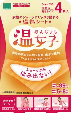 温熱シート 温女子 4枚入 商品説明 『温熱シート 温女子 4枚入』 女性目線で「こうだったらいいのに!」を形に! 従来の女性用温熱シートを、女子プロジェクトチームで再検討したところ、 1.形状 2.温度 3.持続時間 4.シートの貼り方 5.効果、これらについて、不満や疑問が挙げられました。